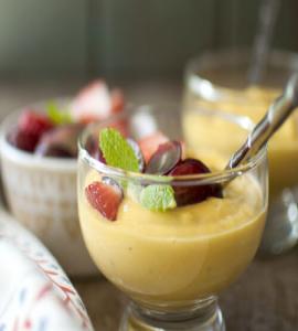 A refreshing mixture of milk, cream, mango pulp, vanilla pudding and garnished with fruits and served cold